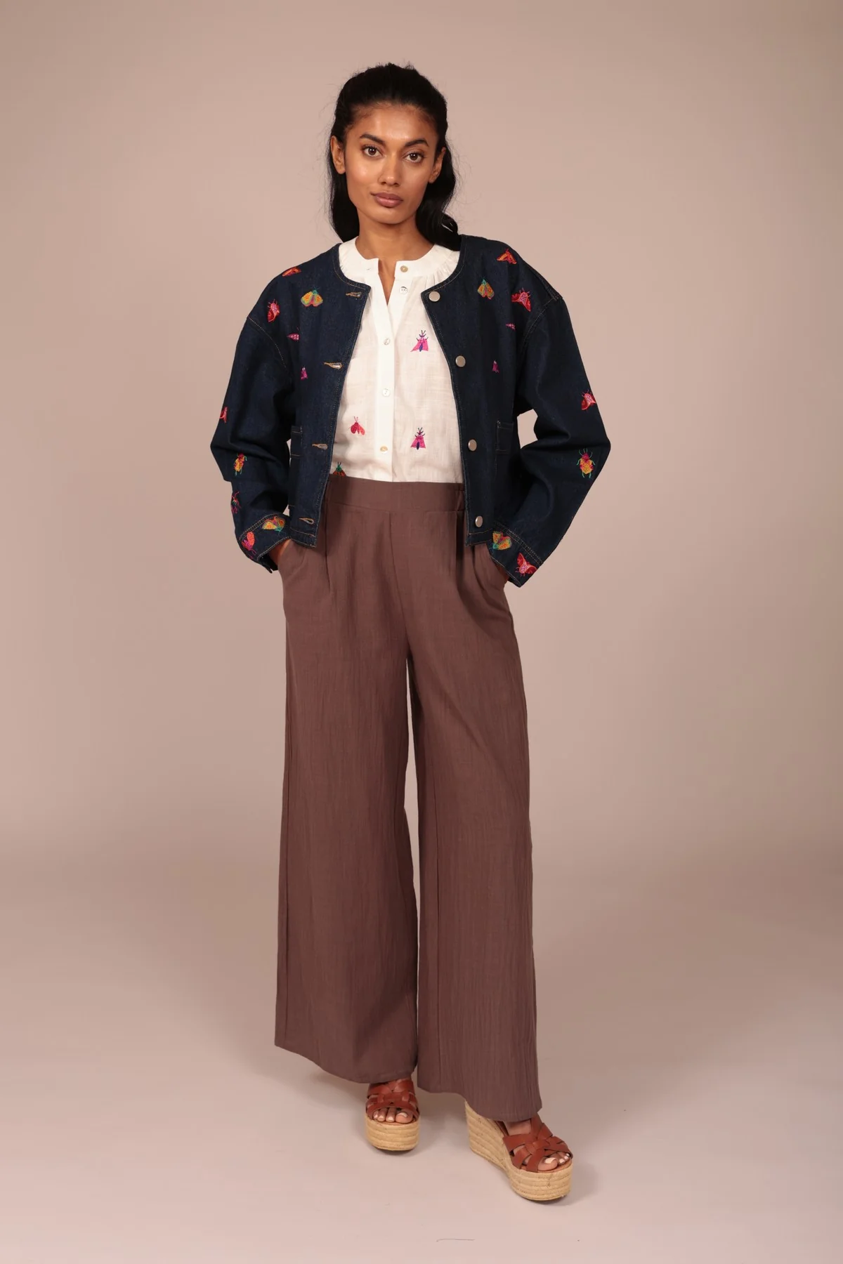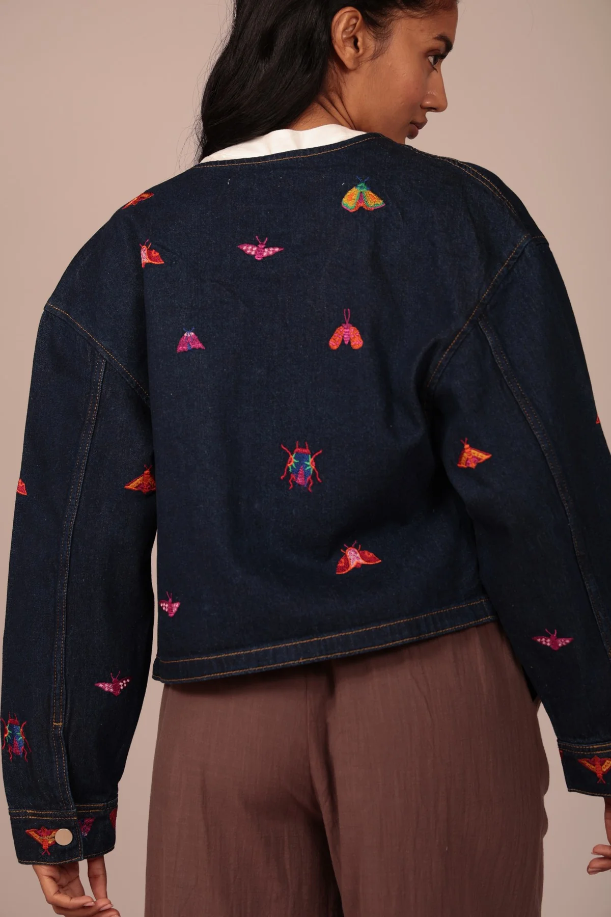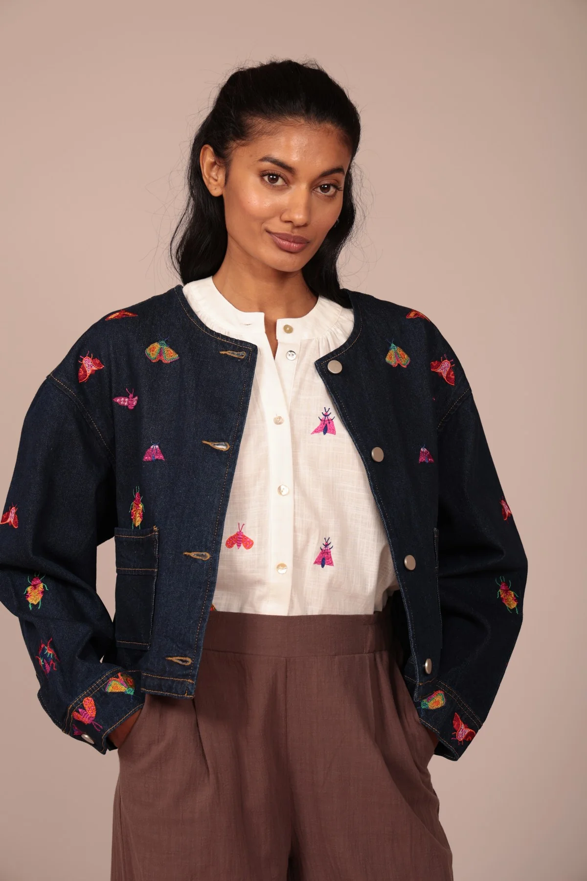 Su diseño de corte recto y relajado mantiene la esencia atemporal del vaquero, mientras que el cuello a la caja limpia la silueta y permite combinarla fácilmente con blusas y vestidos. Los pequeños bordados repartidos por la prenda aportan un detalle delicado y artístico que marca la diferencia con sutileza.