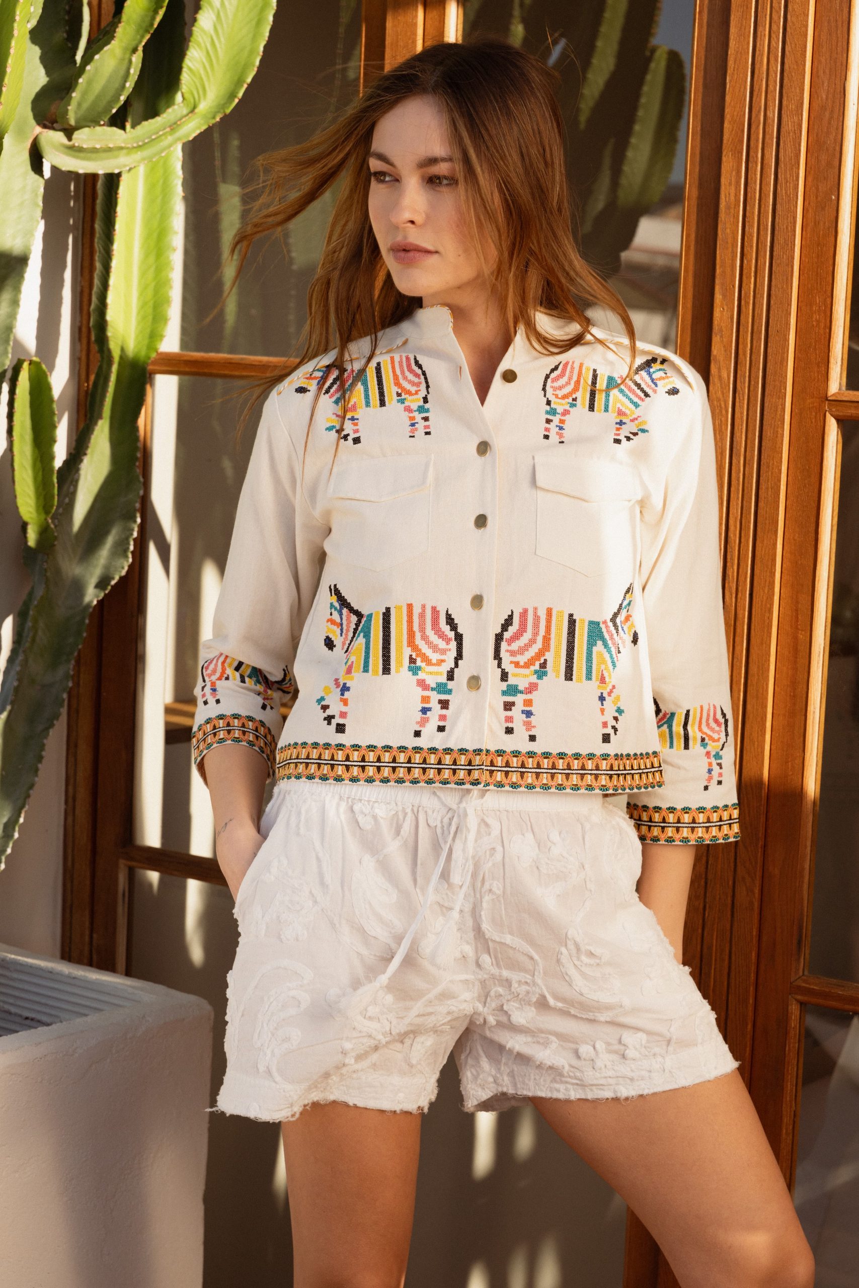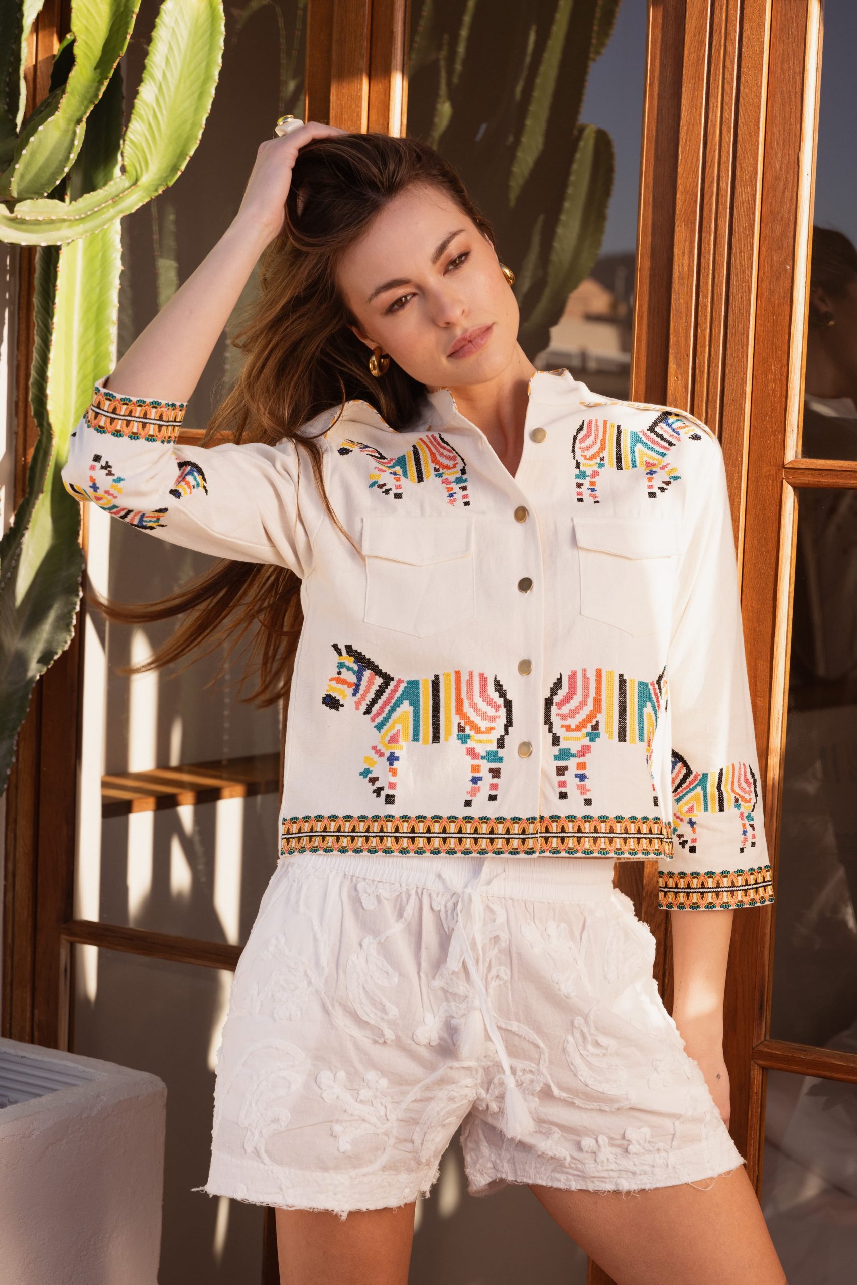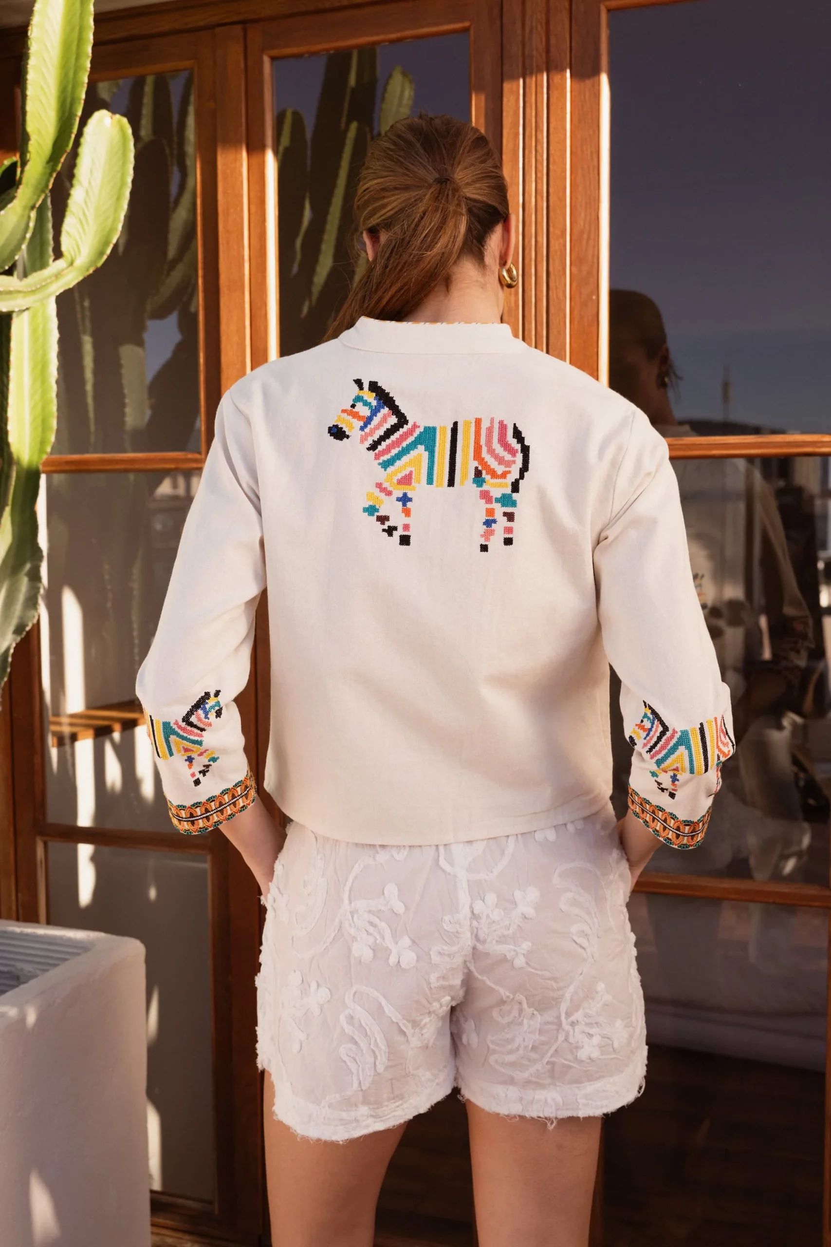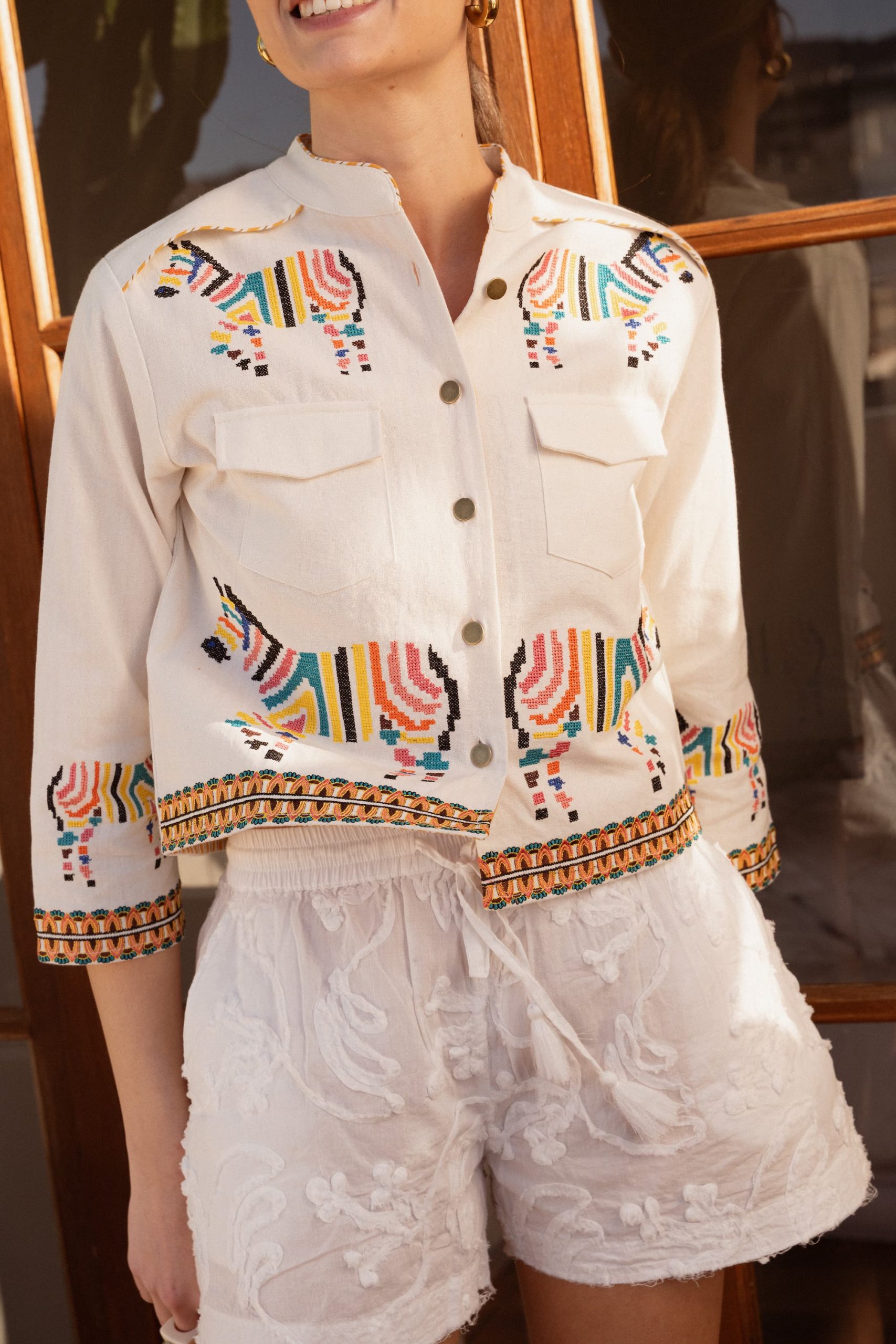 Su corte recto y el cuello mao aportan equilibrio y estructura, haciendo que sea fácil de llevar tanto en el día a día como en planes más relajados. Los bordados de cebras añaden carácter y originalidad, mientras que las cenefas geométricas en puños y bajo completan el diseño con un detalle cuidado y distintivo.