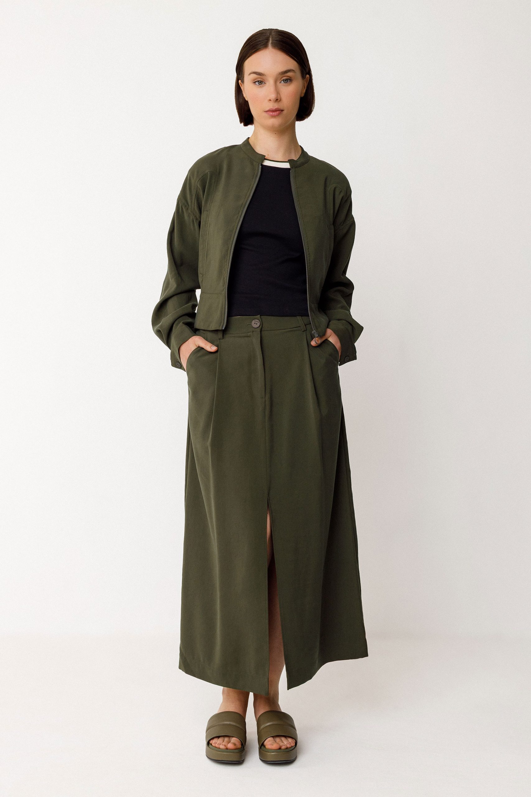 Falda midi de corte acampanado con abertura delantera. Bragueta de cremallera y bolsillos al bies delanteros.
