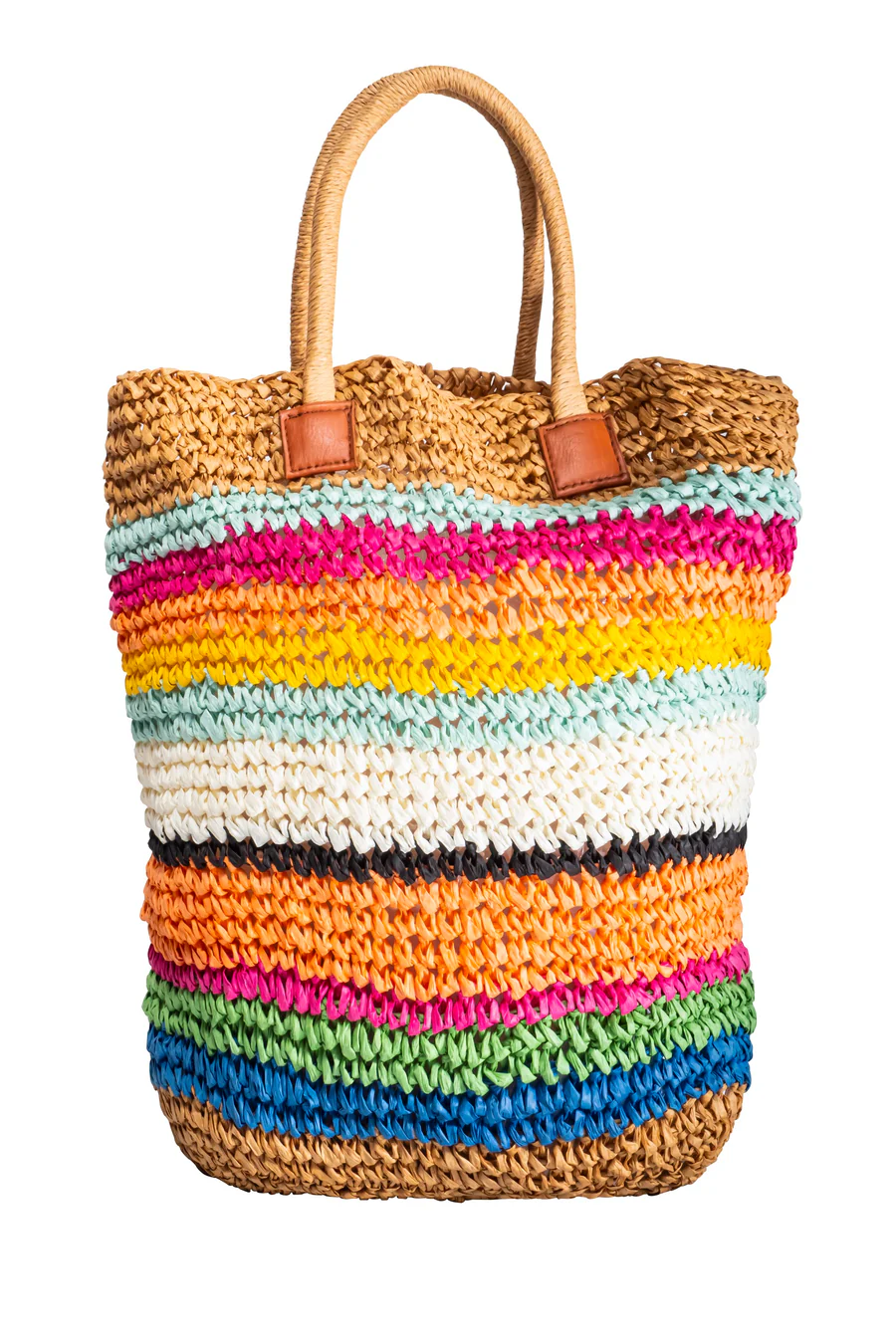 Bolso realizado 100% papel, caracterizado por un divertido motivo multicolor que añade vitalidad y originalidad a tu look. La elaboración artesanal resalta su unicidad, mientras que sus asas cortas y las dimensiones lo hacen perfecto para quienes buscan un accesorio de verano práctico y estiloso.